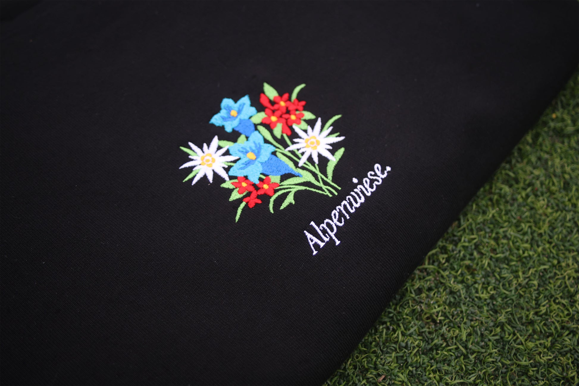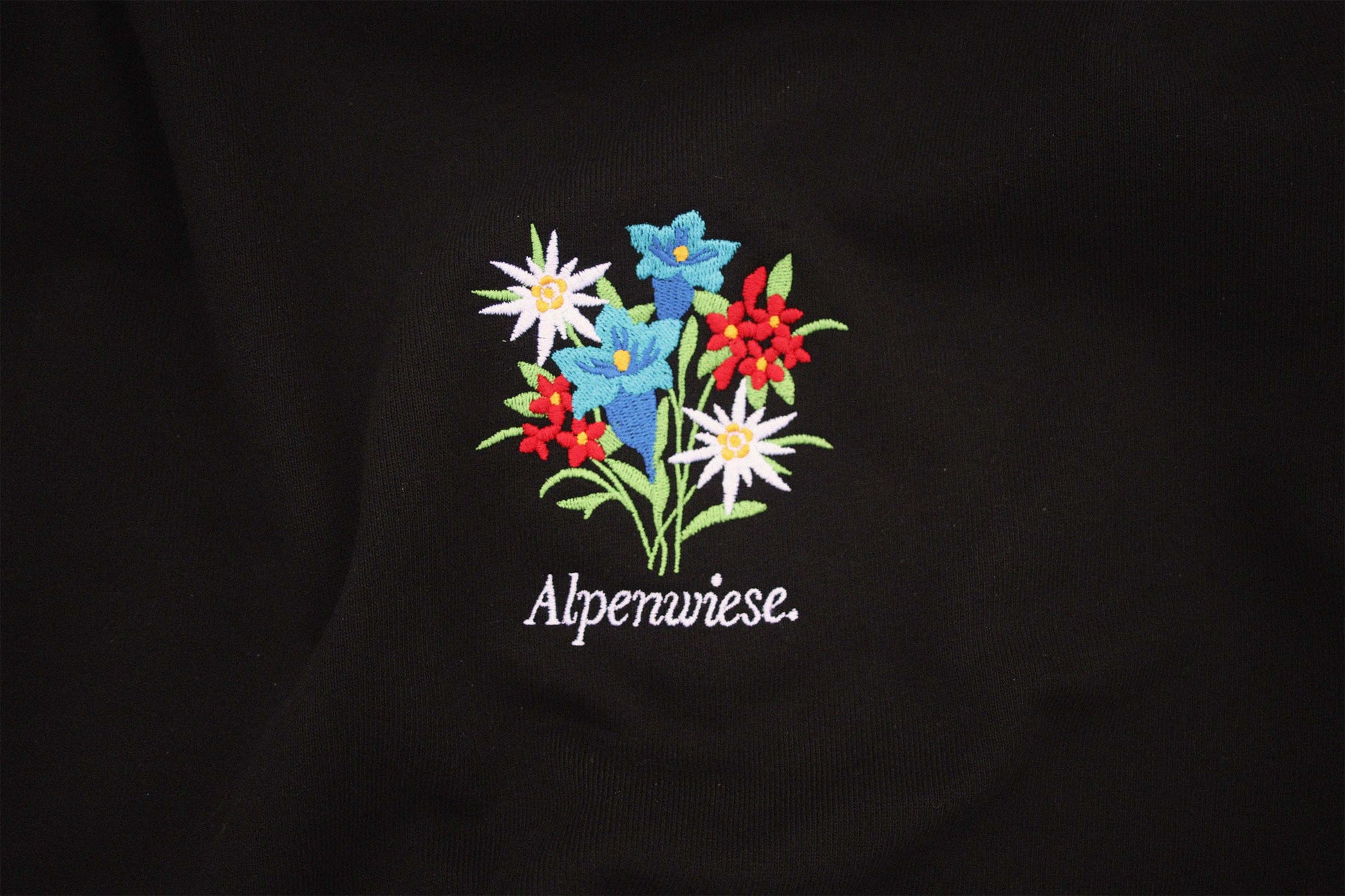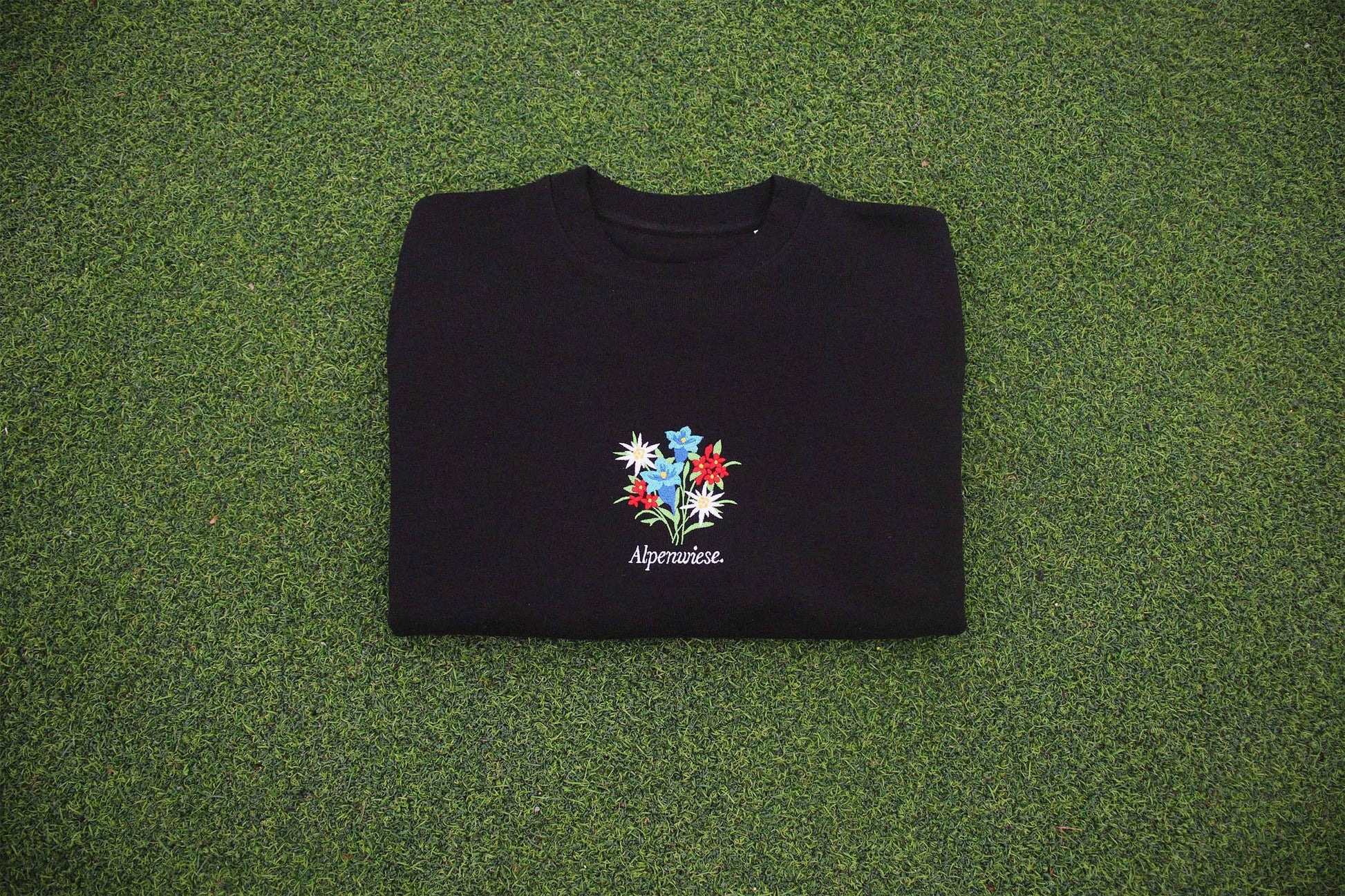Sweatshirt aus Bio-Baumwolle mit 6-farbigem Stickmotiv von Enzian (lat. Gentiana), Edelweiß (lat. Leontopodium) und Alpenrose (lat. Rhododendron ferrugineum).