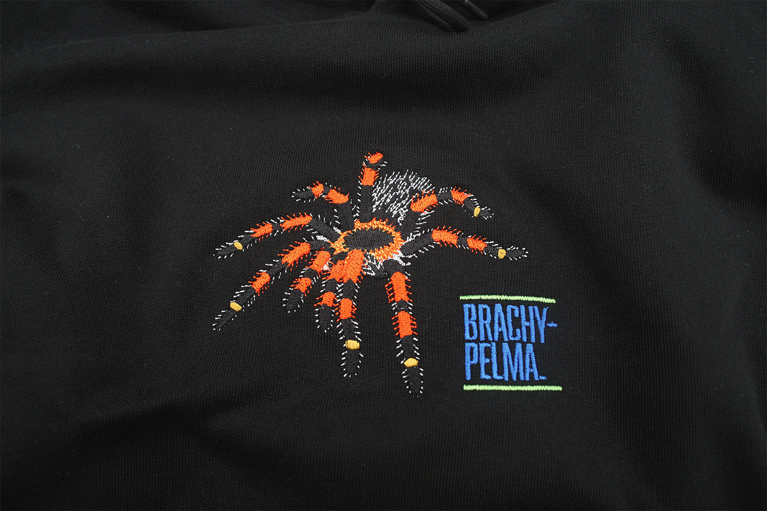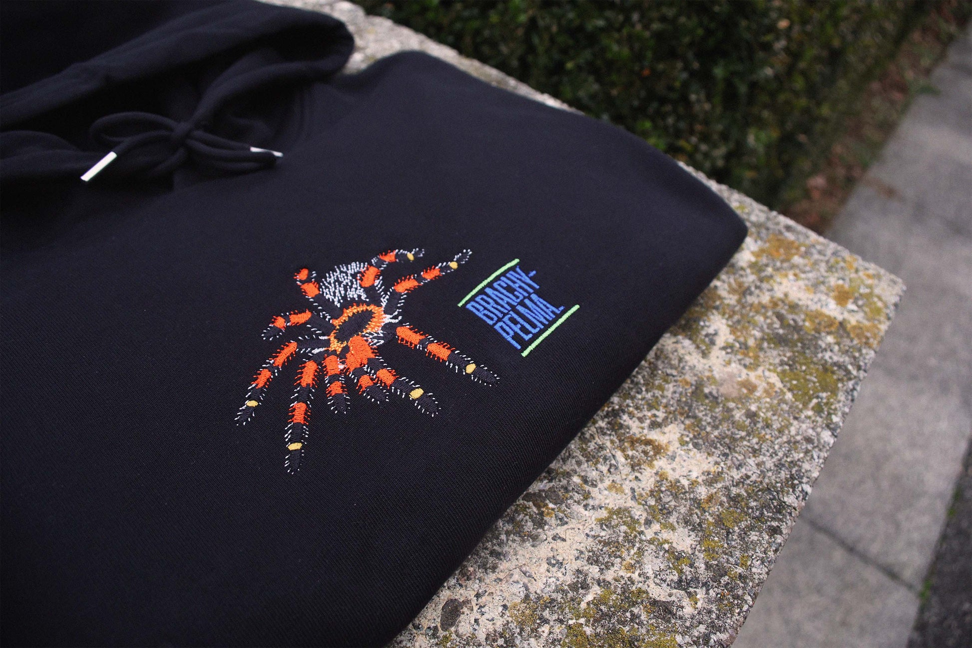 Hoodie aus Bio-Baumwolle mit 6-farbiger Stickerei der Rotknie-Vogelspinne (lat. Brachypelma smithi).