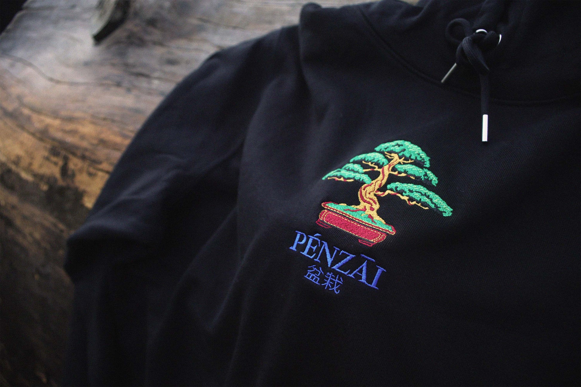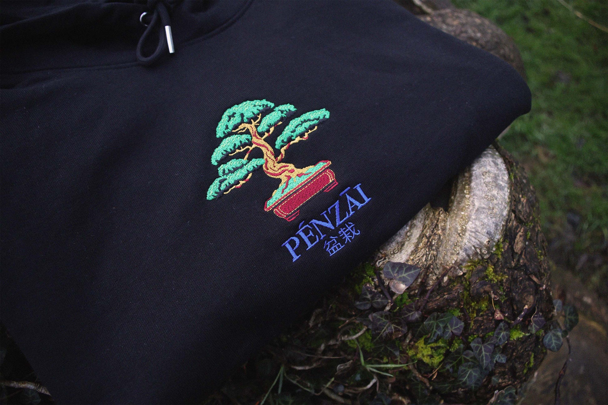 Hoodie aus Bio-Baumwolle mit 6-farbigem Stickmotiv eines Bonsai-Baums. Schriftzug enthält den chinesischen Begriff pénzāi (盆栽), der übersetzt in etwa "Baum in der Schale" bedeutet und auf den der japanische Begriff bonsai zurückgeht.